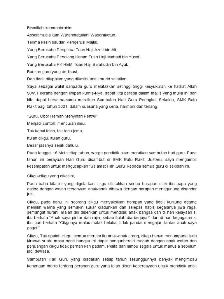 Semoga nasihat, teguran, amanat itu dapat kita jadikan panduan untuk ke arah kecemerlangan. Teks ucapan datuk haji hajiji haji noor, menteri kerajaan tempatan dan perumahan sempena meraikan majlis perpisahan puan p.s. Hadirin sekalian, hari ini merupakan hari yang amat sesuai untuk kita mengadakan sambutan bagi mengenang dan menghargai jasa guru. Assalamualaikum dan selamat sejahtera saya ucapkan. Assalamualaikum wbt, bersongkok bersampin segak berseri berbaju kurung anggun jelita majlis ramah mesra aidil fitri bersamalah kita meraikannya kuih bahulu tradisi kita ketupat rendang pembuka selera tangan dihulur maaf. Saya sebagai wakil murid, ingin mengucapkan selamat menyambut hari guru kepada semua guru di sekolah ini. Dalam hal yang demikian penulis harus memberikan kurung segi empat …. bahwa perubahan teknik itu di buat sendiri oleh penulis, dan tidak ada dalam teks aslinya.
